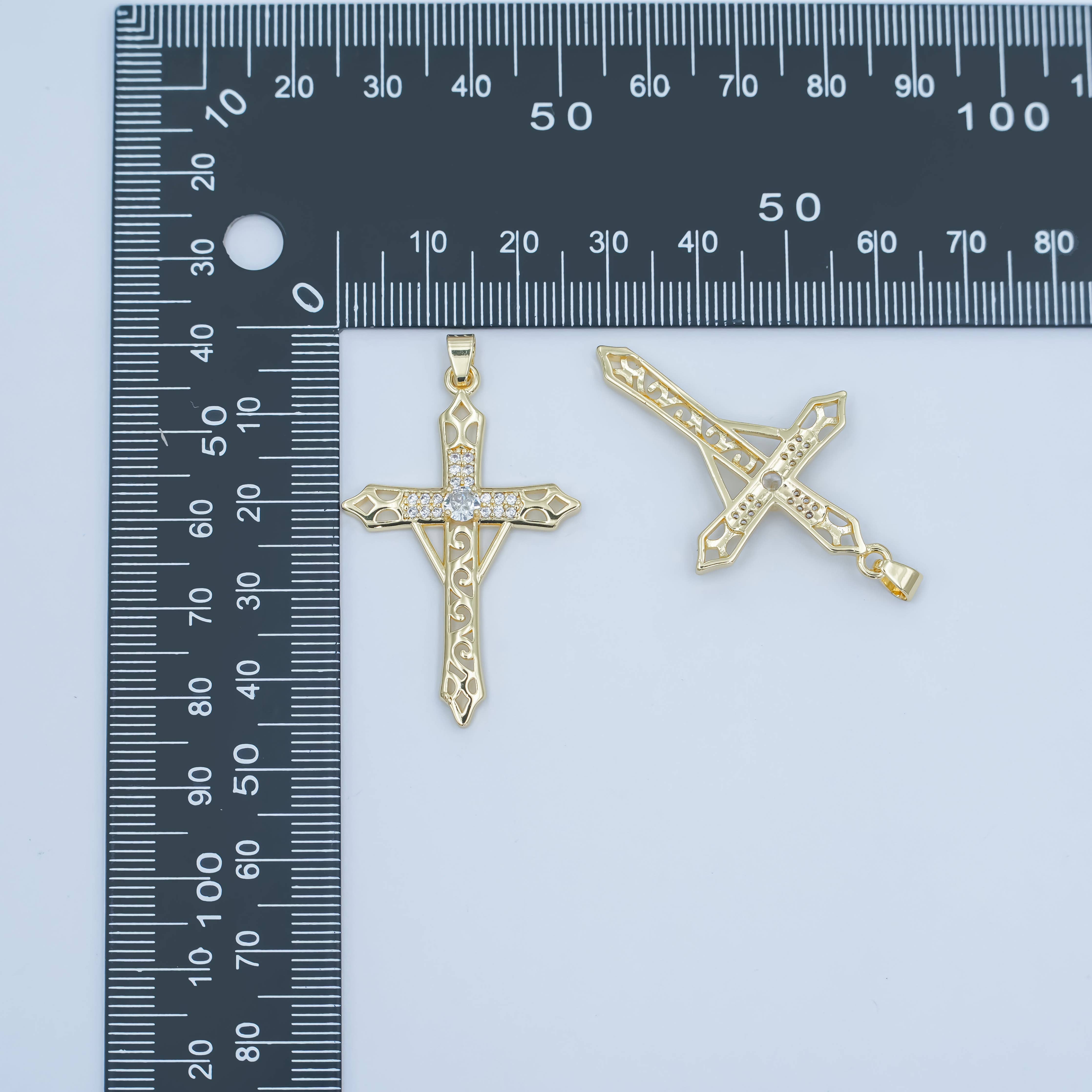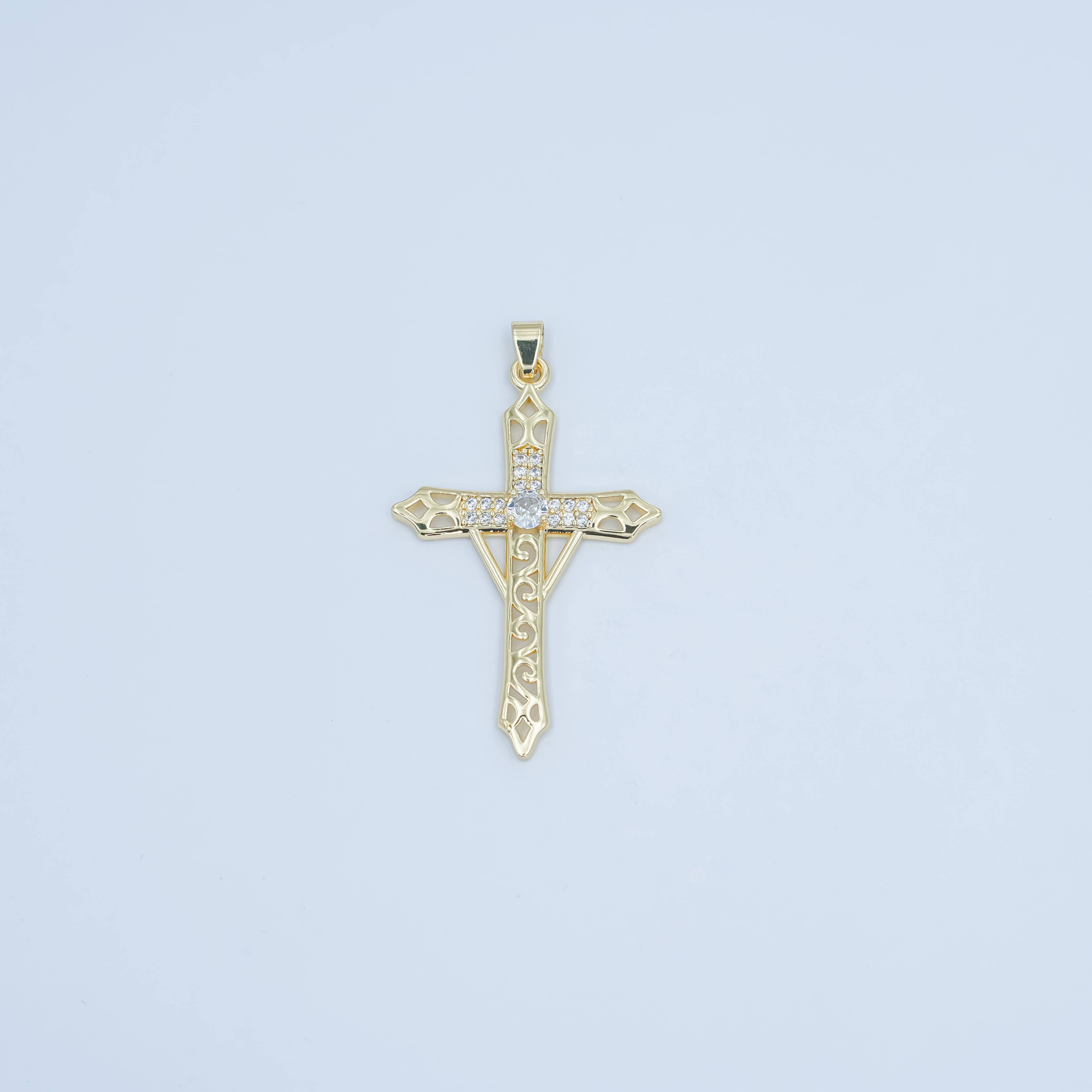 24K Gold Filled Clear CZ Micro Paved Geometric Filigree Cross Pendant | AA1505