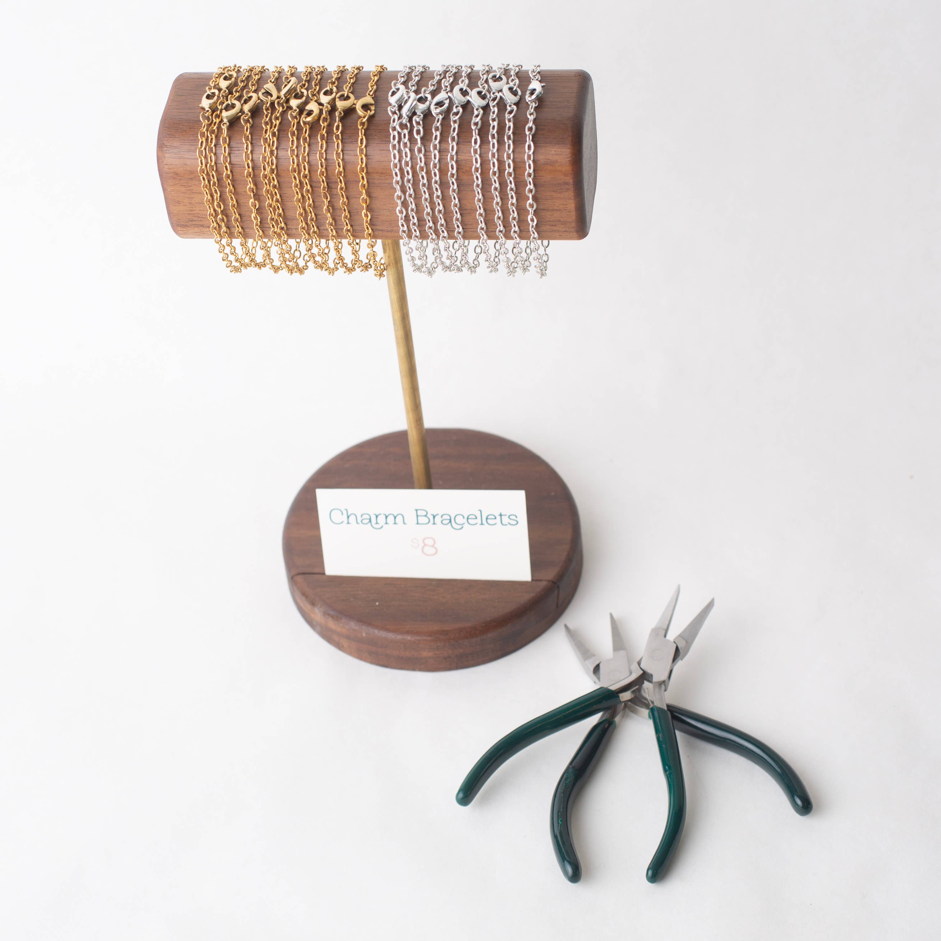 Your community will start creating by choosing a bracelet chain! This Pre-Pack includes 40 bracelet chains, 20 Antique Gold, and 20 Antique Silver. *Photo shows 10 of each comfortably fitting on the display. Prepack includes additional bracelets for restocking. Perfect starter for a charm bar. MSRP: $8/unit Included: 20 - Antique Gold Bracelet 20 - Antique Silver Bracelet At no cost: 1 - Handmade Walnut & Brass Bracelet Stand 1 - Sign Printed with MSRP 1 - Pair of Flat Nose Pliers *Note: If you are adding charm bracelets to your jewelry bar, please remember that charms will need to be added by your team using a pair of flat-nose pliers, and a pair will be included with your order. Metal Information: * Materials made in the U.S., Assembled in the Dominican Republic * Brass Base Metal Chain with an Antiqued .999 Fine Silver or 24K Gold * Finished with Lobster Clasp * 7.5" in length * Adjustable, links are large enough for the clasp to attach to any link